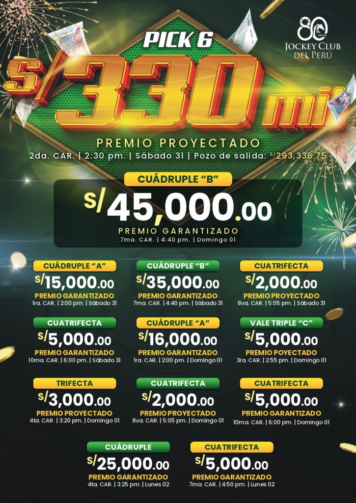 Hoy en el Hipódromo de Monterrico, el Pick-6 tiene un pozo acumulado de 293,336.75 soles y con un premio proyectado de 330,000.00 soles, para el solitario boleto. ADEMÁS, otros pozos disponibles