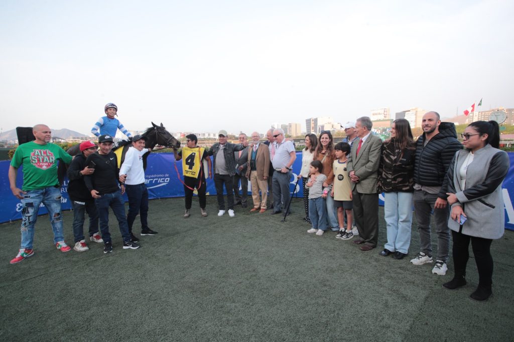 El Dr. Alfredo Gastañeta y familiares en el herraje de vencedores luego del triunfo de su potranca Sensacion con Nilton Guevara y su entrenador Carlos Gastañeta quien la presentó en su mejor estado