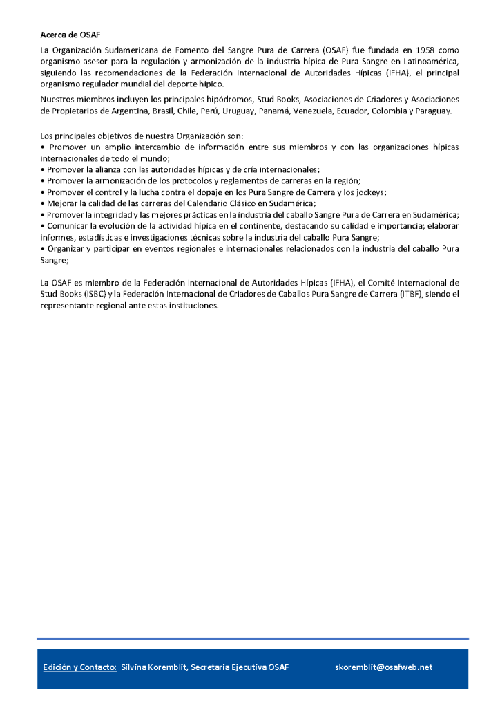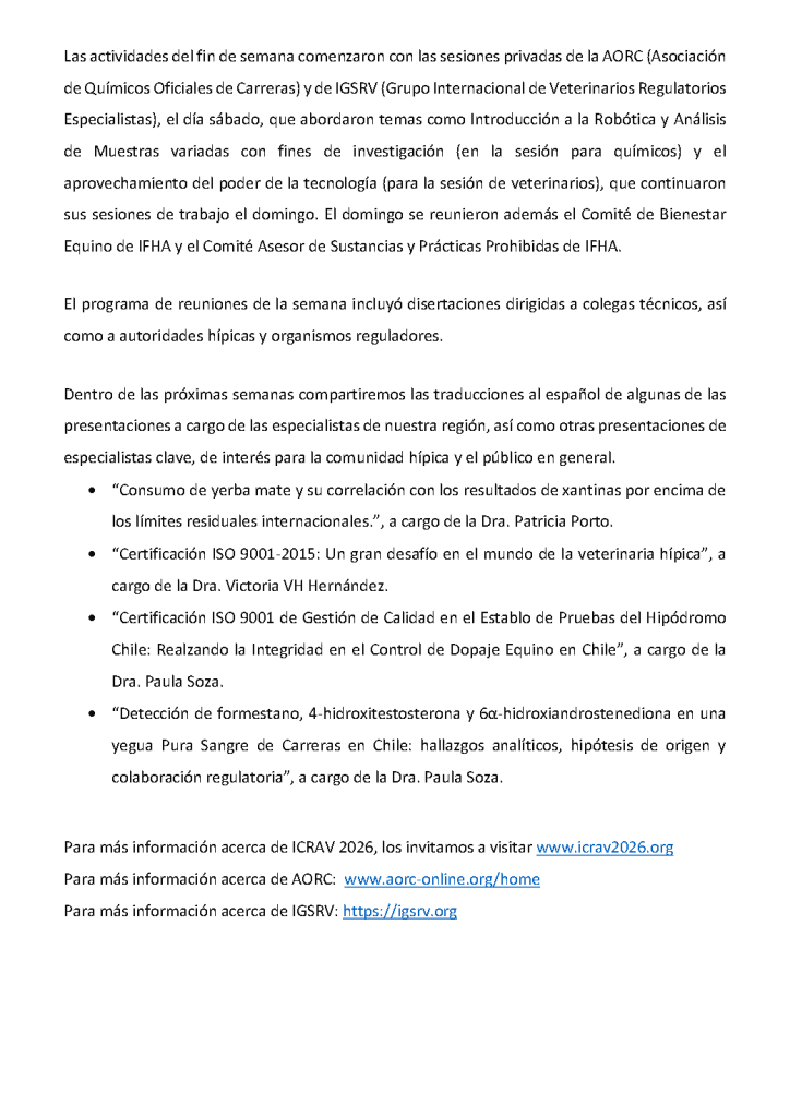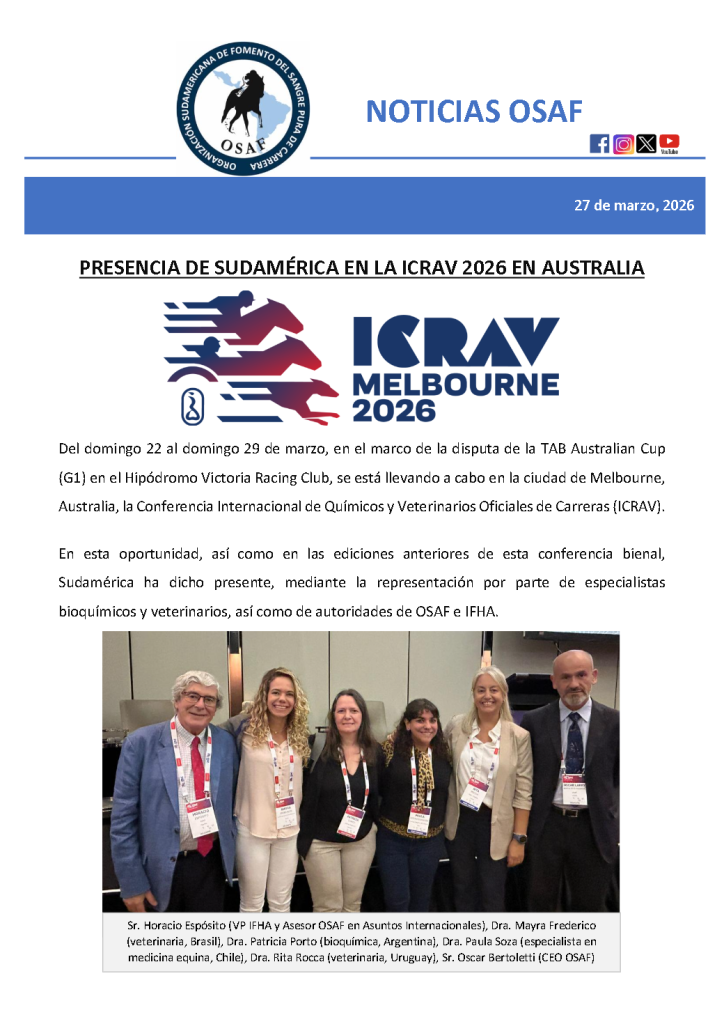 Es digno de destacar la labor «Titánica» de parte del equipo del Turf Latinoamericano, que se representó el pasado domingo 22 y 29 de marzo pasado en la «ICRAV 2026 EN AUSTRALIA«. El equipo comandado por el señor Esposito, tubo una semana de trabajo en representación de la Hípica Latinoamericana, ya que estuvieron los profesionales que figuran en la foto oficial como: Señor Horacio Esposito (Vice Presidente de la IFHA, por Latinoamérica y Asesor de OSAF en asuntos Internacionales), que es la imagen representativa y máxima Autoridad del Turf «Latino», así mismo estuvieron la señorita Mayra Federico (Veterinaria de origen brasilero). la Dra. Patricia Porto (Bioquímica de origen Argentina), Dra. Paula Soza (Especialista en equina en Chile), Dra. Rita Rocca (Veterinaria de Uruguay) y el señor Oscar Bertoletti, quien es el (Ceo de OSAF). No cabe duda que es muy importante destacar la ardua labor de parte de todos los profesionales que cruzaron el Mundo, para hacernos notar en estos Importantes Eventos Internacionales y así miso hacernos respetar que tenemos una Hípica «Latina» muy buena y avanzada.