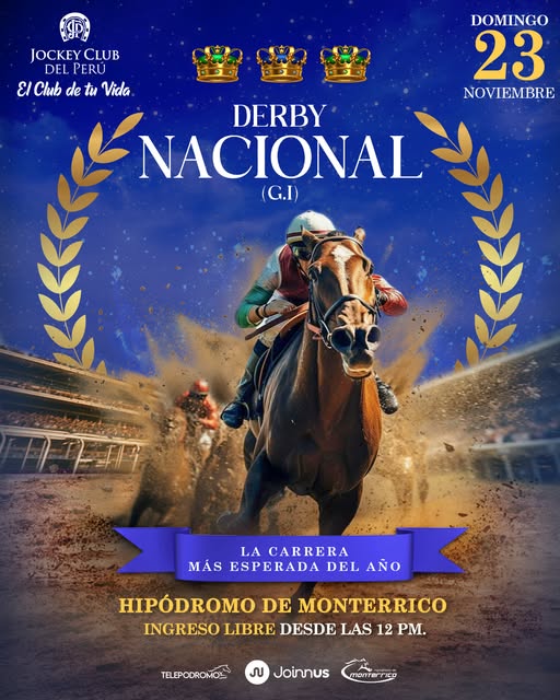 Éste domingo 23 de noviembre, el Perú y su Hípica están de fiesta con el motivo del “DERBY NACIONAL (G.I), donde es la coronación al mejor producto de 3 años llamada la “Cinta Azul”. El Derby Nacional es una competición hípica del mejor Sangre Pura de Carrera pura de 3 años de edad que se disputa en el cada año del Turf Peruano y que se corrió desde el 1903 en Hipódromo de Santa Beatriz, en 1940 se pasó al Hipódromo de San Felipe y en 1961 al Hipódromo de Monterrico. El Derby Nacional es la tercera corona de las 4 que conforman la Cuádruple Corona peruana. Se corre sobre la pista de arena y en una distancia de 2400 metros en pista de arena.